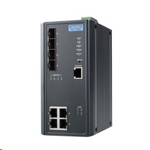 Řízený průmyslový PoE přepínač s 4x 10/100Base-TX porty s podporou IEEE 802.3af/at a 4x gigabitovými SFP sloty. Vhodný pro náročné aplikace, včetně dopravních a železničních systémů, s provozním teplotním rozsahem -40 až +75 °C.
